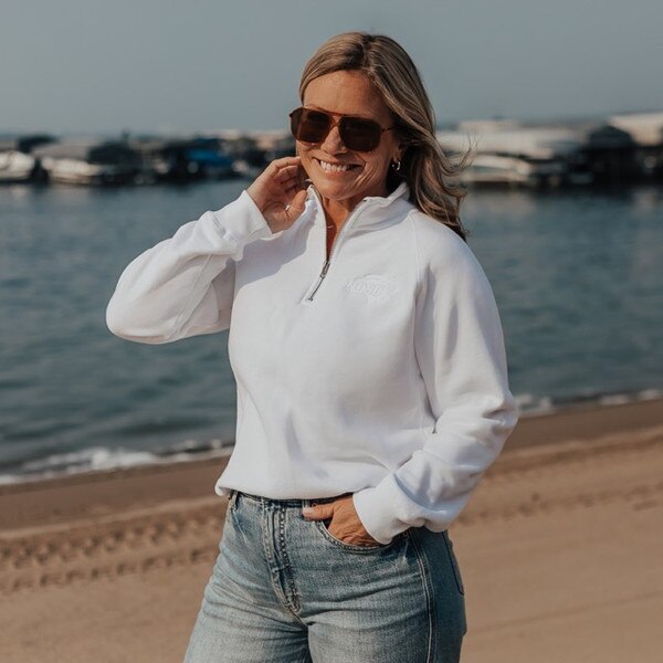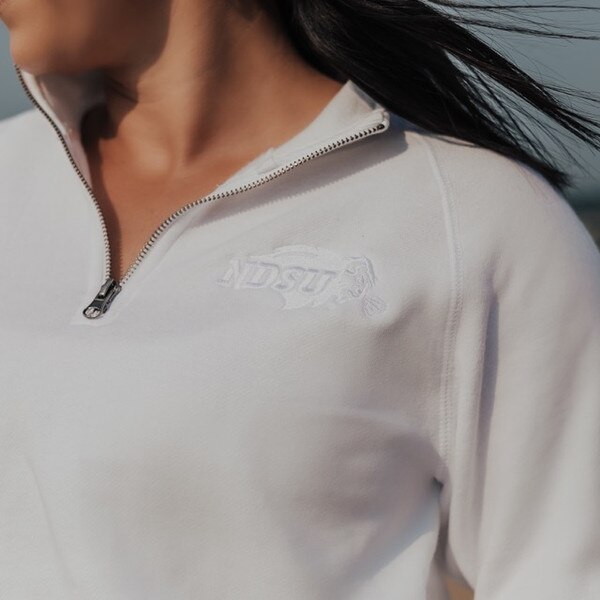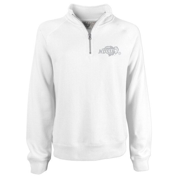1/4 Zip Crew - Ladies White By Blue 84 Pinit $59.99 SKU: LADIES-CREW-BLUE-84-QUARTER-ZIP-EMBROIDERED-WHITE Select Size : Small Medium Large X-large Quantity -+ Add to Cart Details 60% cotton, 40% polyester8 oz.Quarter zip crew neckline2x1 rib cuffs and waistbandDecorative cover stitching throughoutRelaxed fitEmbroidered tonal ND... Details Back Details60% cotton, 40% polyester8 oz.Quarter zip crew neckline2x1 rib cuffs and waistbandDecorative cover stitching throughoutRelaxed fitEmbroidered tonal NDSU Bison logo on left chestAvailable in white