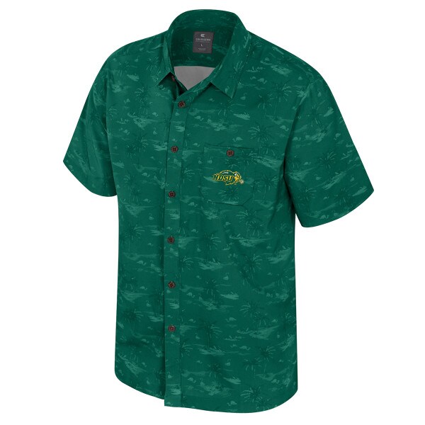 This collared button-up shirt exudes a unique and stylish vibe. The engraved wooden buttons add a touch of elegance and a natural element to the overall design. A standout feature is the buttoned pocket on the left chest, which showcases an embroidered NDSU Primary logo, adding a subtle yet distinctive detail. The real showstopper, however, is the vibrant design featuring flamingos and palm trees. This tropical-inspired print brings a fun and playful element to the shirt, making it perfect for those who want to add a touch of personality to their wardrobe. The shirt is available in a rich forest green hue, providing a versatile and classic option that can be easily dressed up or down.