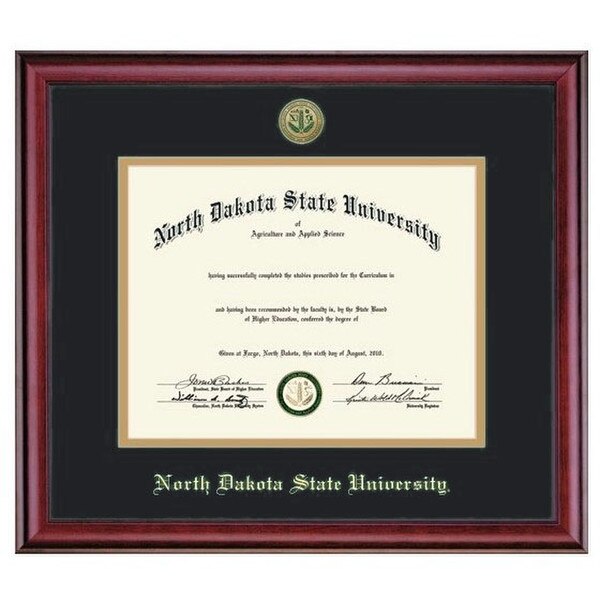 Show off your certification of education success with a custom NDSU frame -Rich, burnished-cherry finish -17" x 19" ECO frame -For every frame purchased, a tree is planted -NDSU seal medallion -Gold leaf embossed text -Available with Green or Black Matboard -Available with Green Enameled Medallion or Gold Medallion
