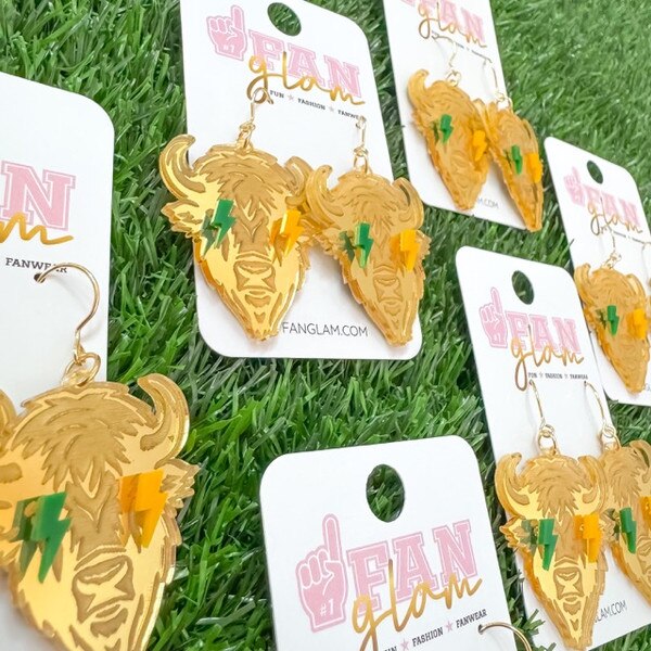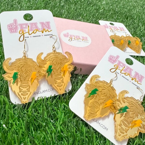 Earrings - Lightning Bolt Bison By Fan Glam Bestseller ItemBESTSELLER Pinit $28.99 SKU: 55061100049 Quantity -+ Add to Cart Details The perfect addition to your gameday look! Includes 1 pair of earrings French hook back Approximately 1.25" wide x 1.5" high Gold mirror bison design ... Details Back DetailsThe perfect addition to your gameday look! Includes 1 pair of earrings French hook back Approximately 1.25" wide x 1.5" high Gold mirror bison design with green & gold lightning bolt eyes!