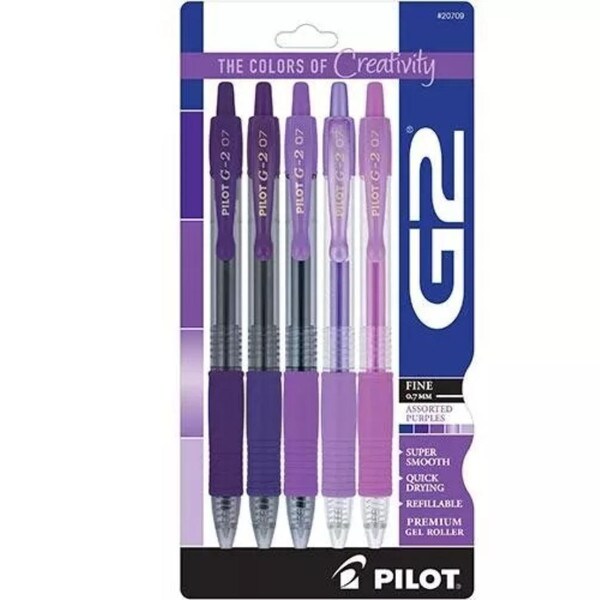 - Includes 5 Fine Point (0.7mm) Pilot G2 purple gel pens: iris blue, grape, purple, metallic purple, and pastel purple