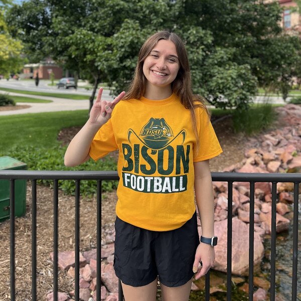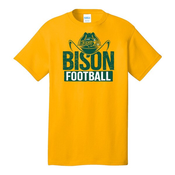 T-Shirt - Bison Football Cowboy Hat Gold Sale ItemSALE Pinit $10.98 SKU: 64071104050 Select Size : Small This item is IN STOCK Quantity -+ Add to Cart Details Original Price - $18.99Classic fitScreen printed NDSU Bison Football cowboy hat designAvailable in gold Details Back DetailsOriginal Price - $18.99Classic fitScreen printed NDSU Bison Football cowboy hat designAvailable in gold